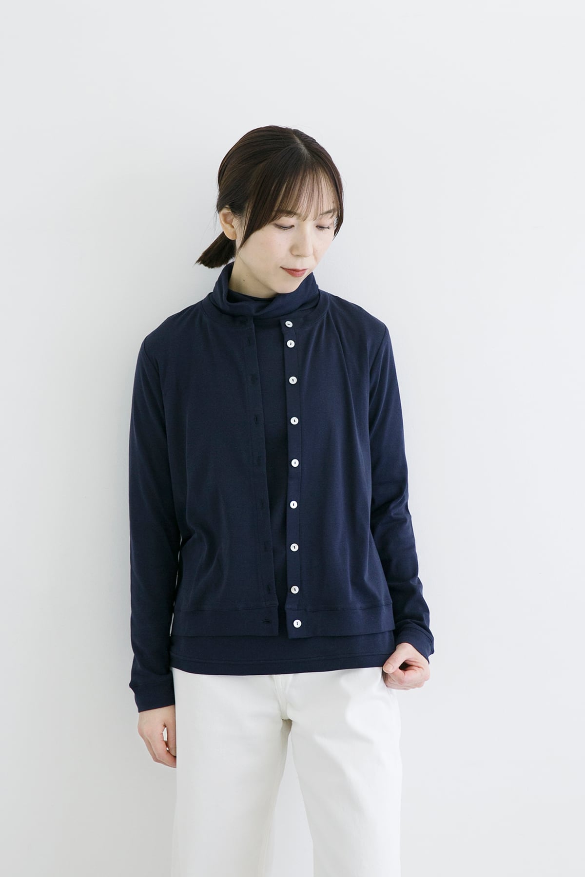 季節の変わり目に持ち歩きできるカーディガン。 前シーズンでラインナップしたところ、とても便利だと評価を頂きましたので、再度メニューに加えました。多めの貝ボタンがチャームポイント。生地は120番手の極細のコットン糸を、フライス編みしたもの。細やかな編み立てなので肌触りが柔らかなストールのように、軽やかで良い着心地です。
