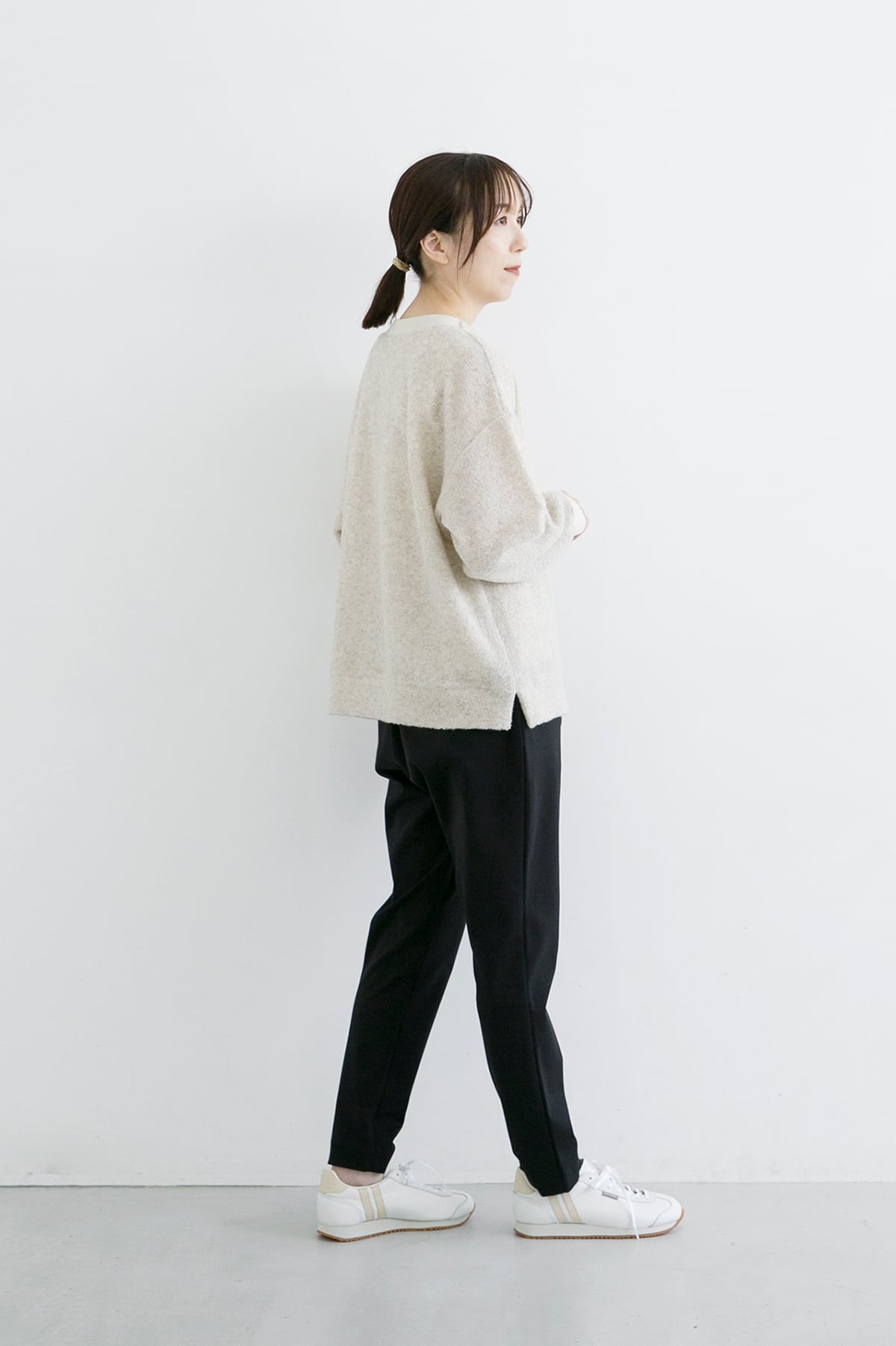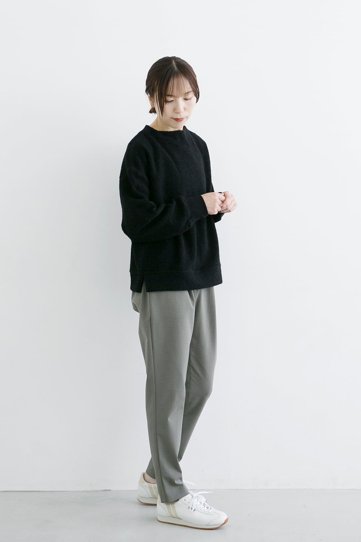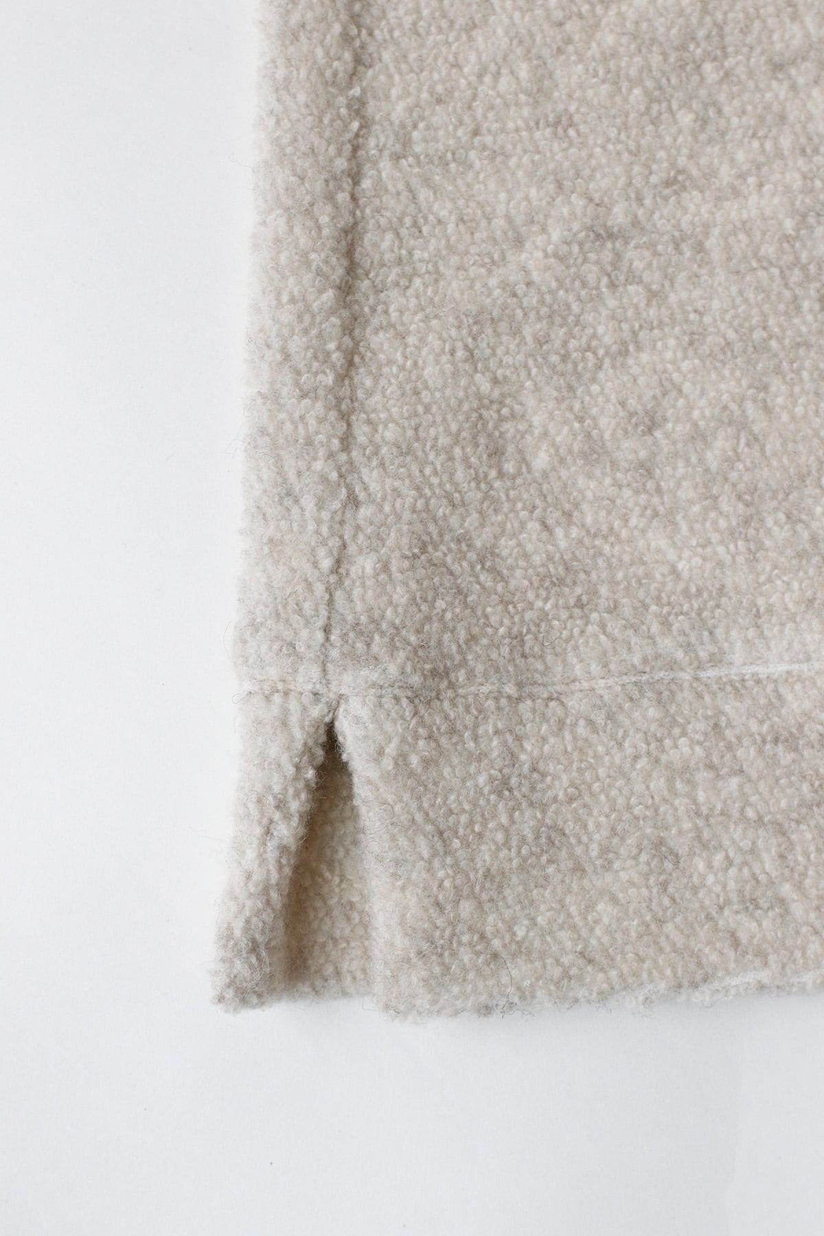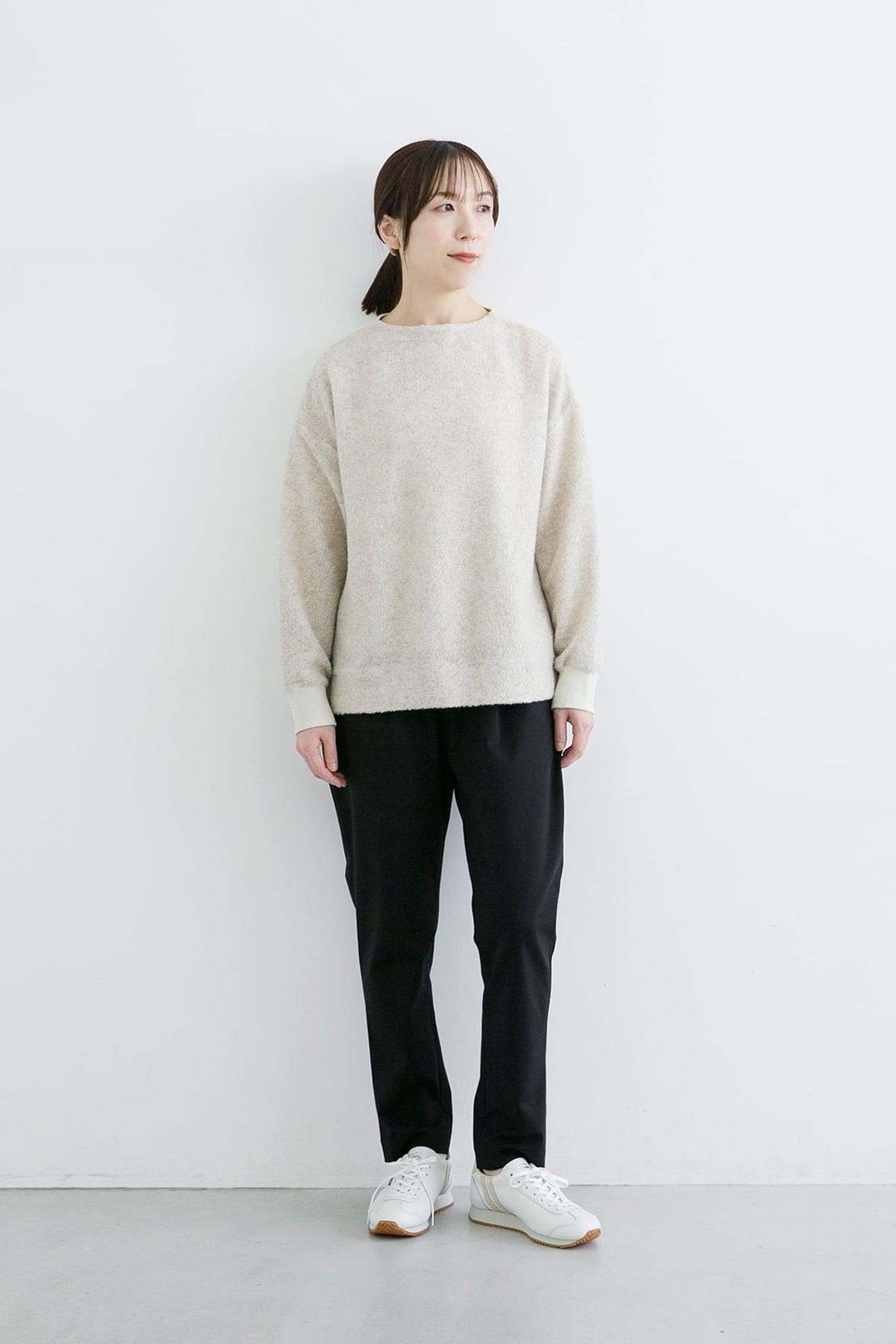 とても軽くて程よい温かさのプルオーバー。この素材は、厚みが出すぎないようふんわりと丸みのある柔らかなミニループ糸を、片面のみ表面に編み出しています。見た目のボリュームより、とても軽量です。薄めのパイル地ですが包み込むようなウールの温かさがあります。またボートネックの衿裏は、綿素材で肌あたりをやさしくサポートしています。