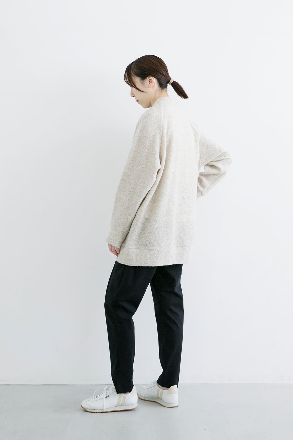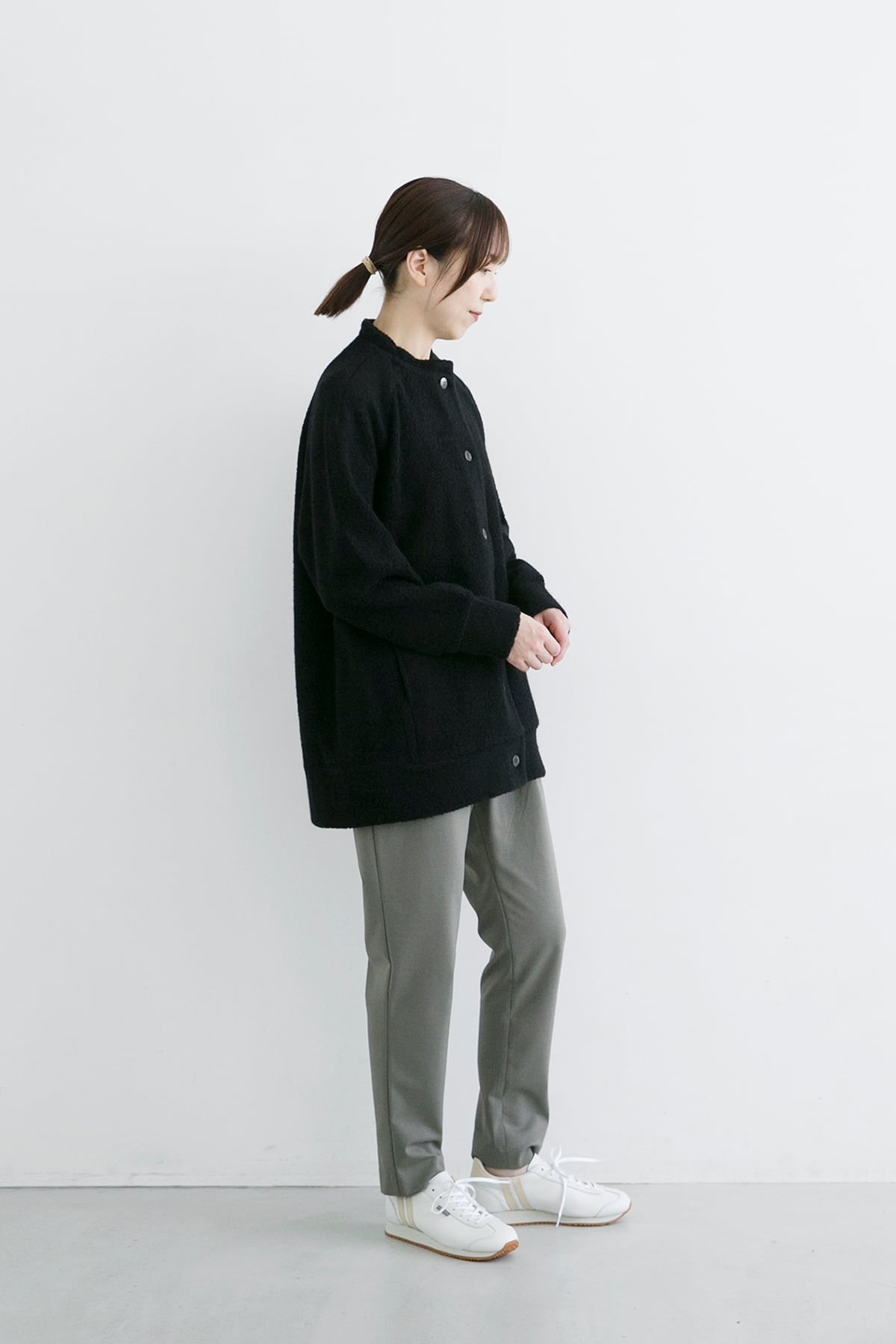 ふわっと身体にやさしいパイルの羽織りもの。重くなりがちなロングカーディガンですがループパイル素材はとても軽量で柔らかく冬の羽織りものに適しています。襟元は小さく、ふくらみをもたせた衿使い、腰回りは、ゆるい丸みのあるコクーンラインにしているので、ボディラインを気にせず、ラフに羽織って頂けます。