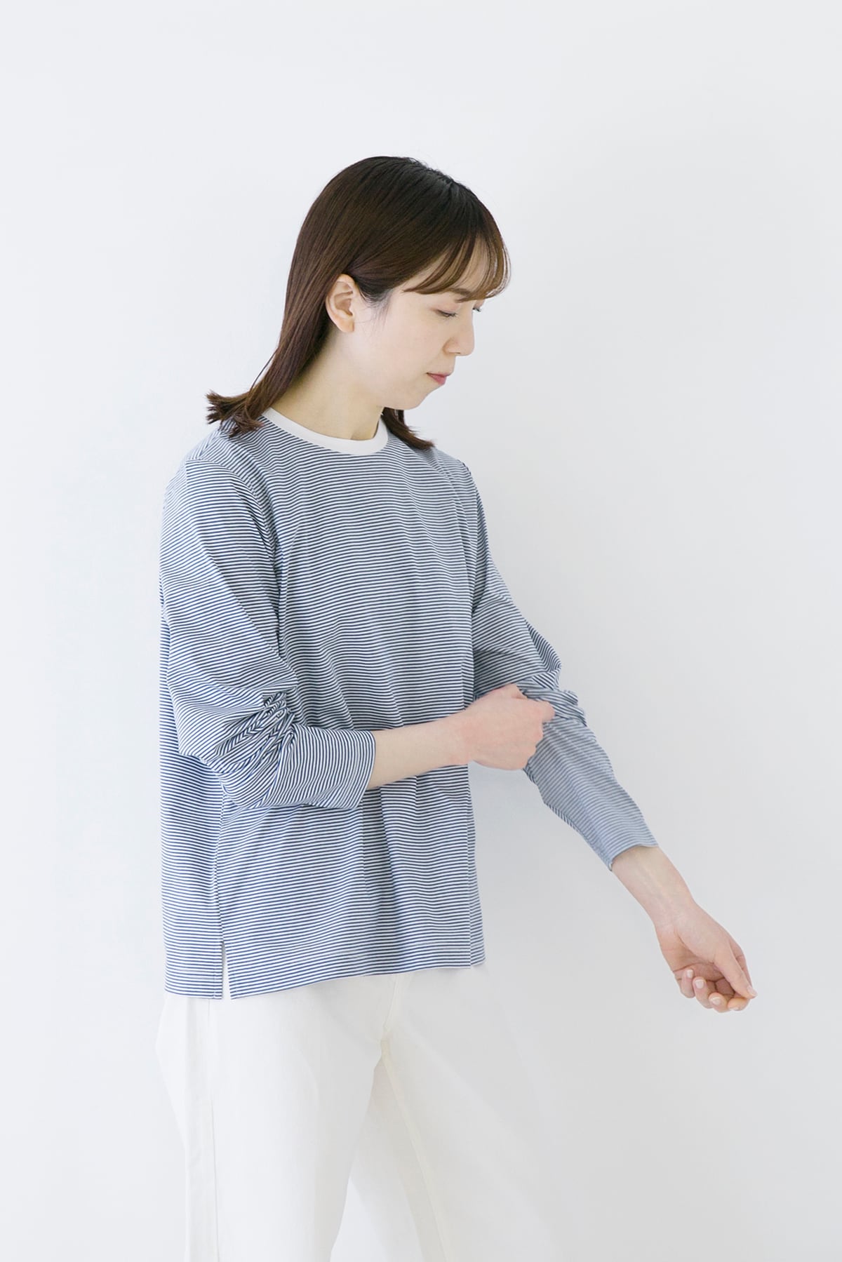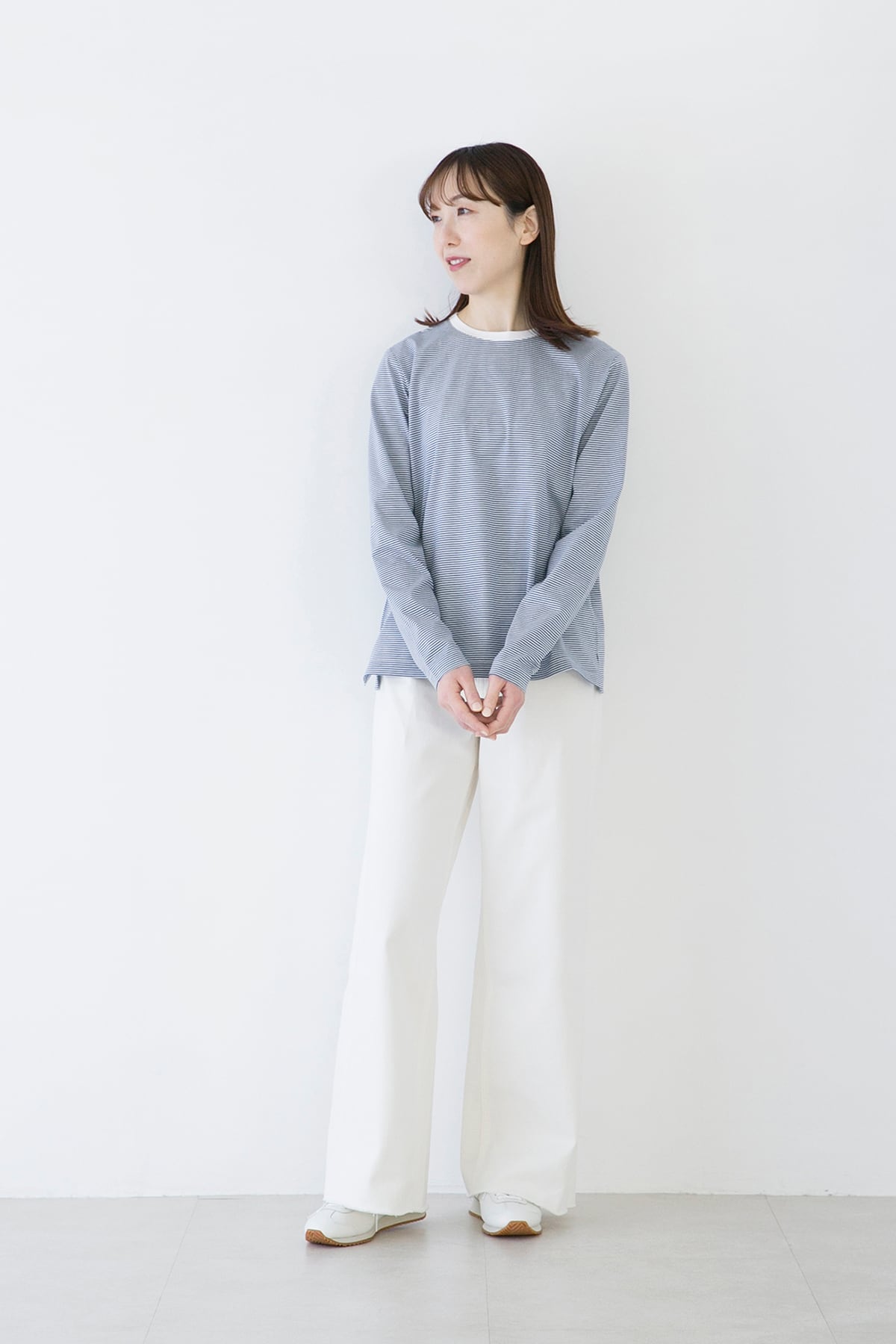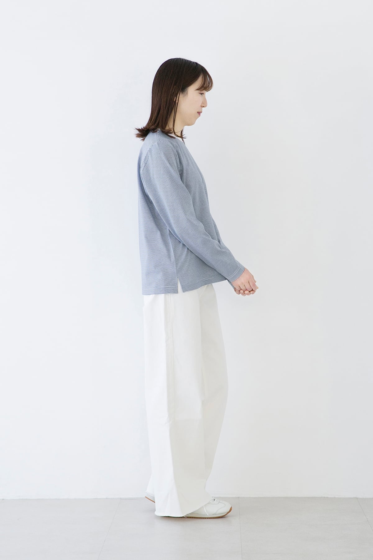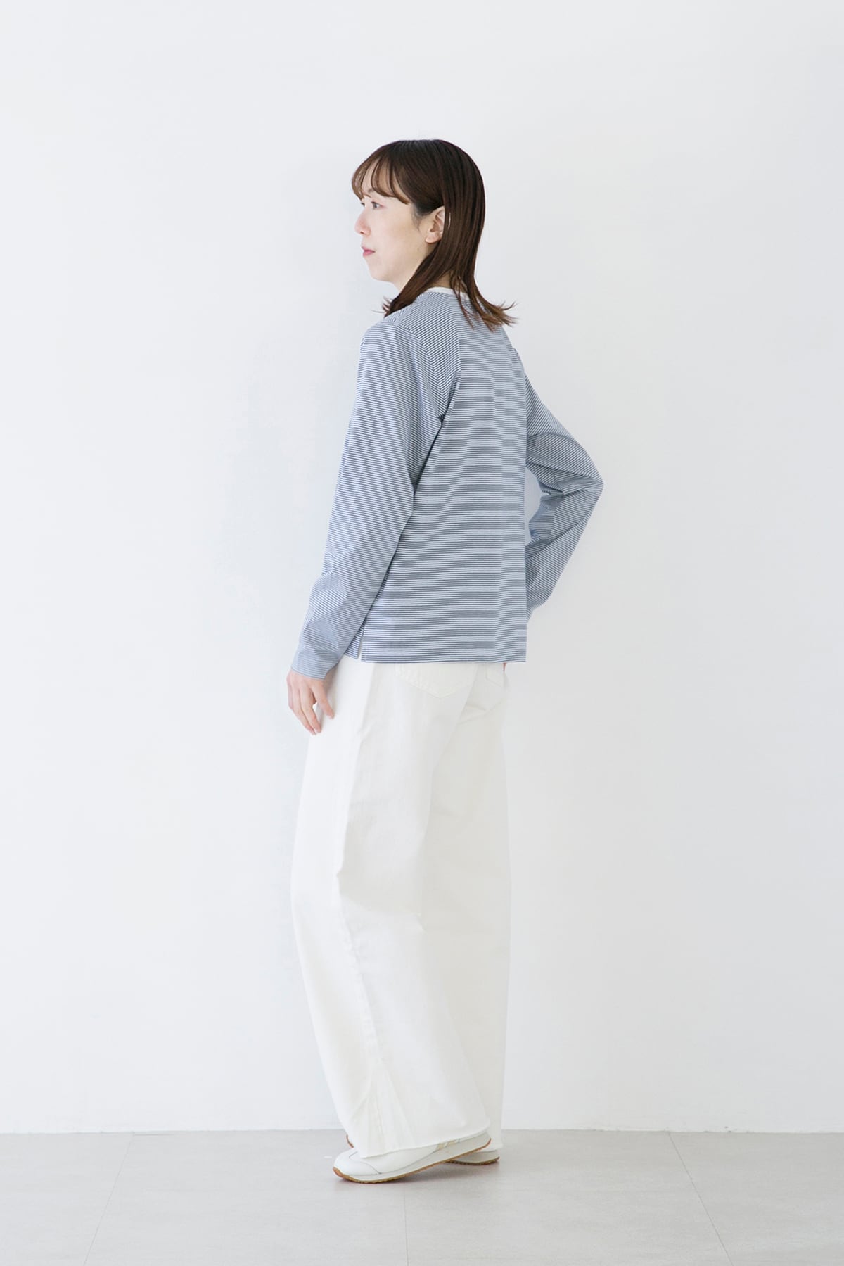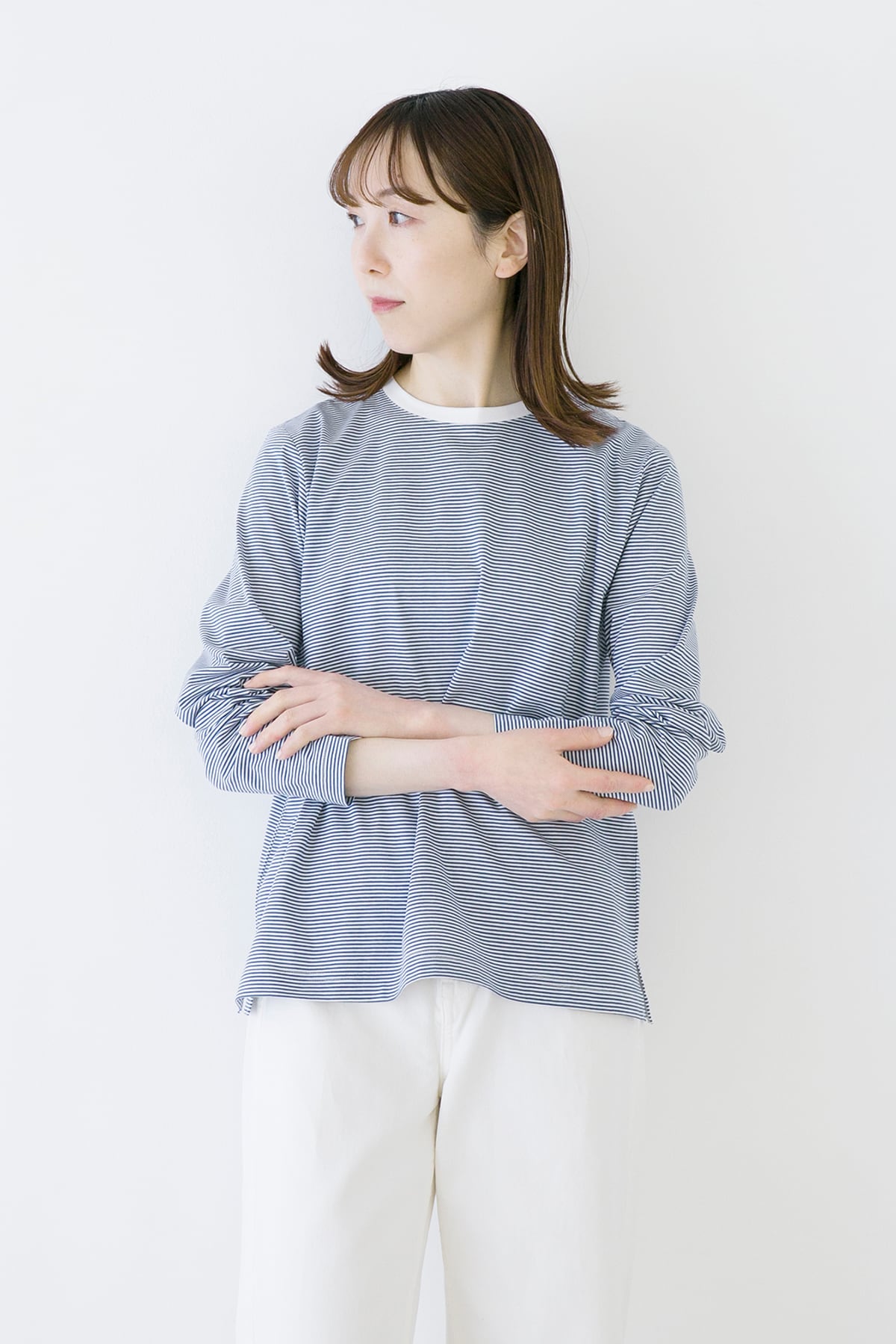 春先は細番手の度詰めオーガニックコットン。秋のコレクションでデビューしたオーガニックコットンですが、26SSも細いエレガントなストライプと細身のシルエットで再びラインナップしました。コンパクトな配色の衿ぐり、あえて長めにした袖は、少したくし上げると、袖口がエレガントな印象になります。無地ライクなストライプは主張が控えめなので組み合わせに便利です。
