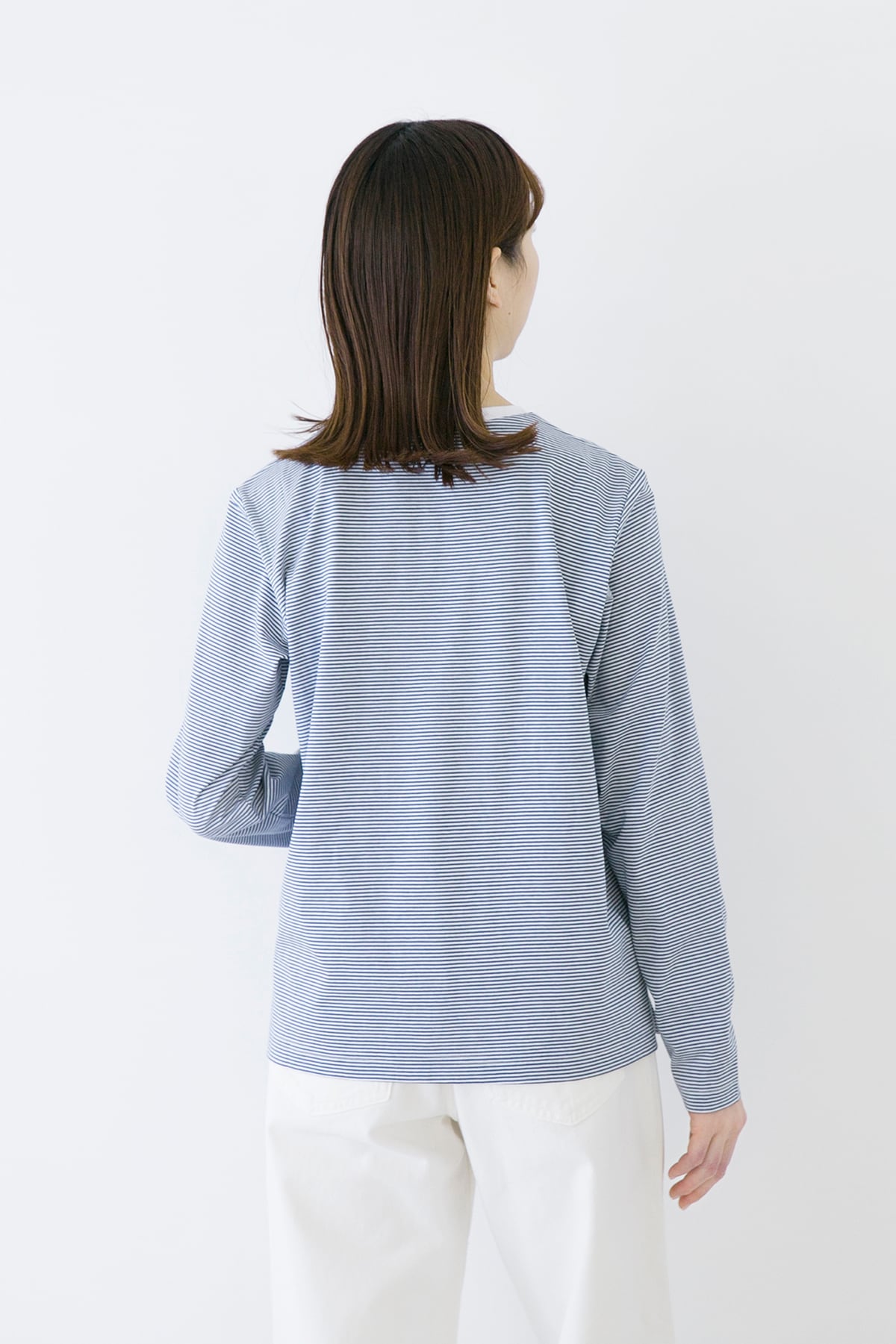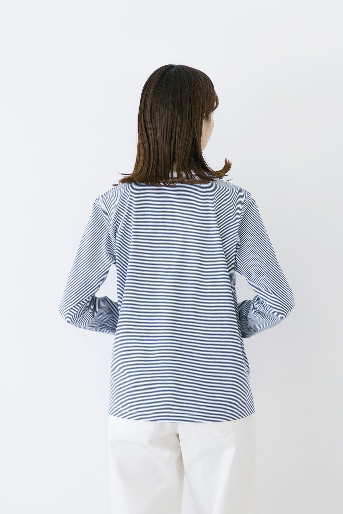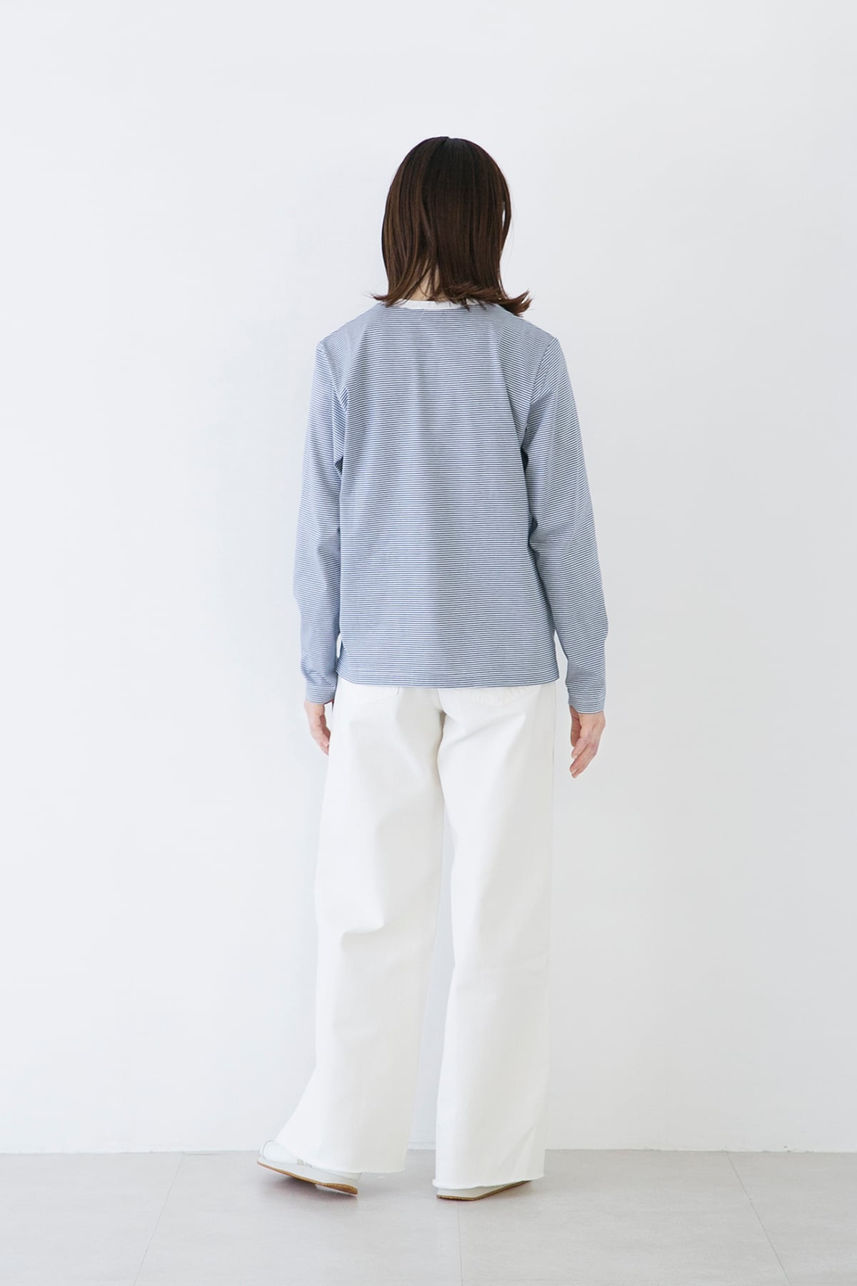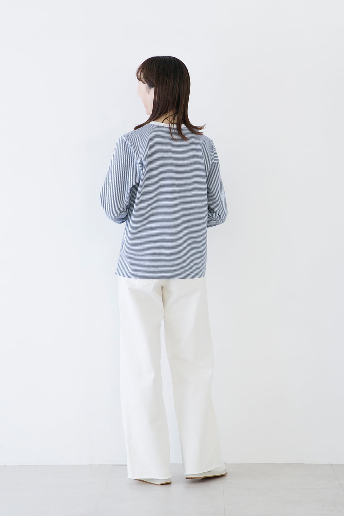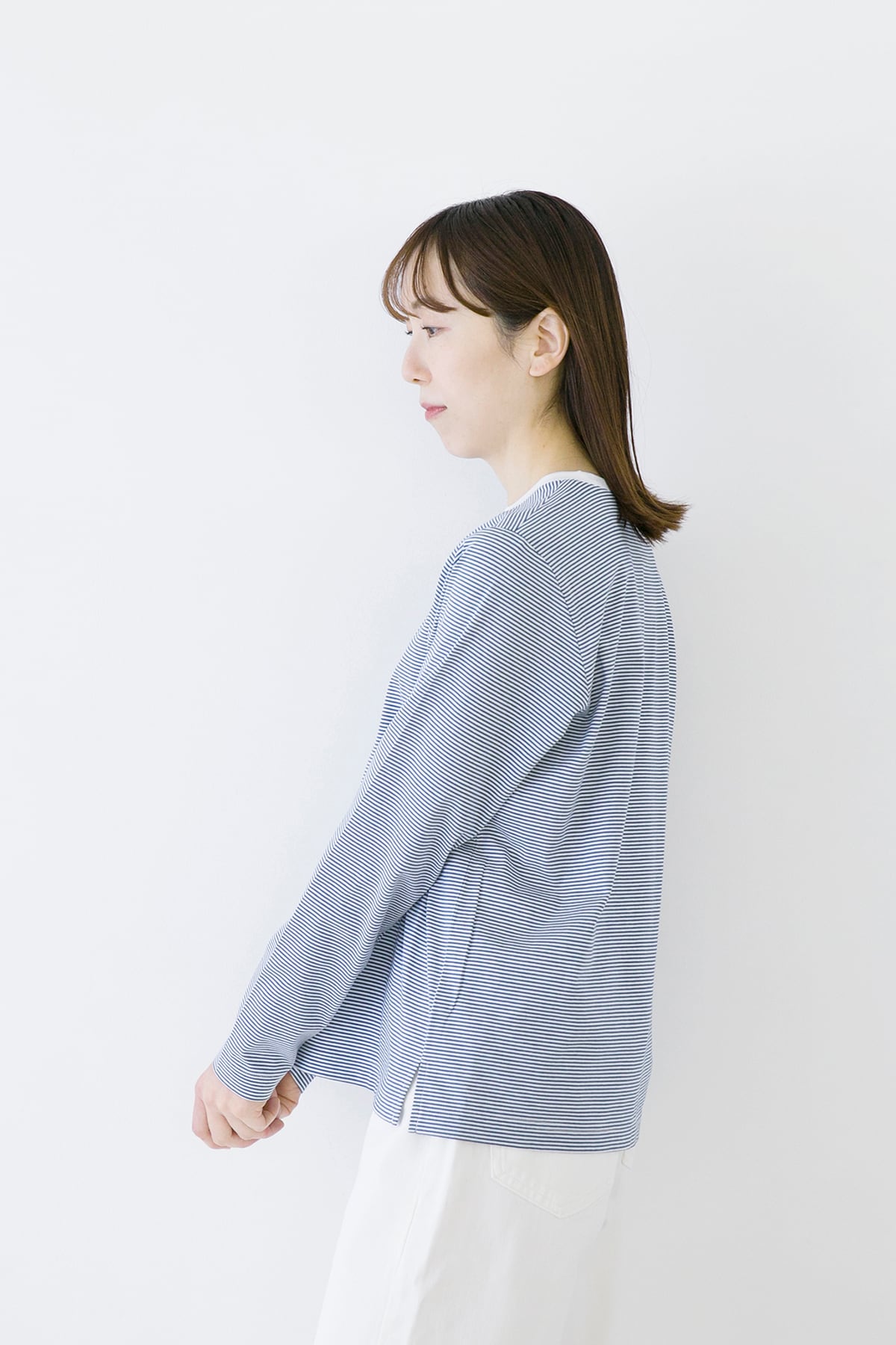 春先は細番手の度詰めオーガニックコットン。秋のコレクションでデビューしたオーガニックコットンですが、26SSも細いエレガントなストライプと細身のシルエットで再びラインナップしました。コンパクトな配色の衿ぐり、あえて長めにした袖は、少したくし上げると、袖口がエレガントな印象になります。無地ライクなストライプは主張が控えめなので組み合わせに便利です。