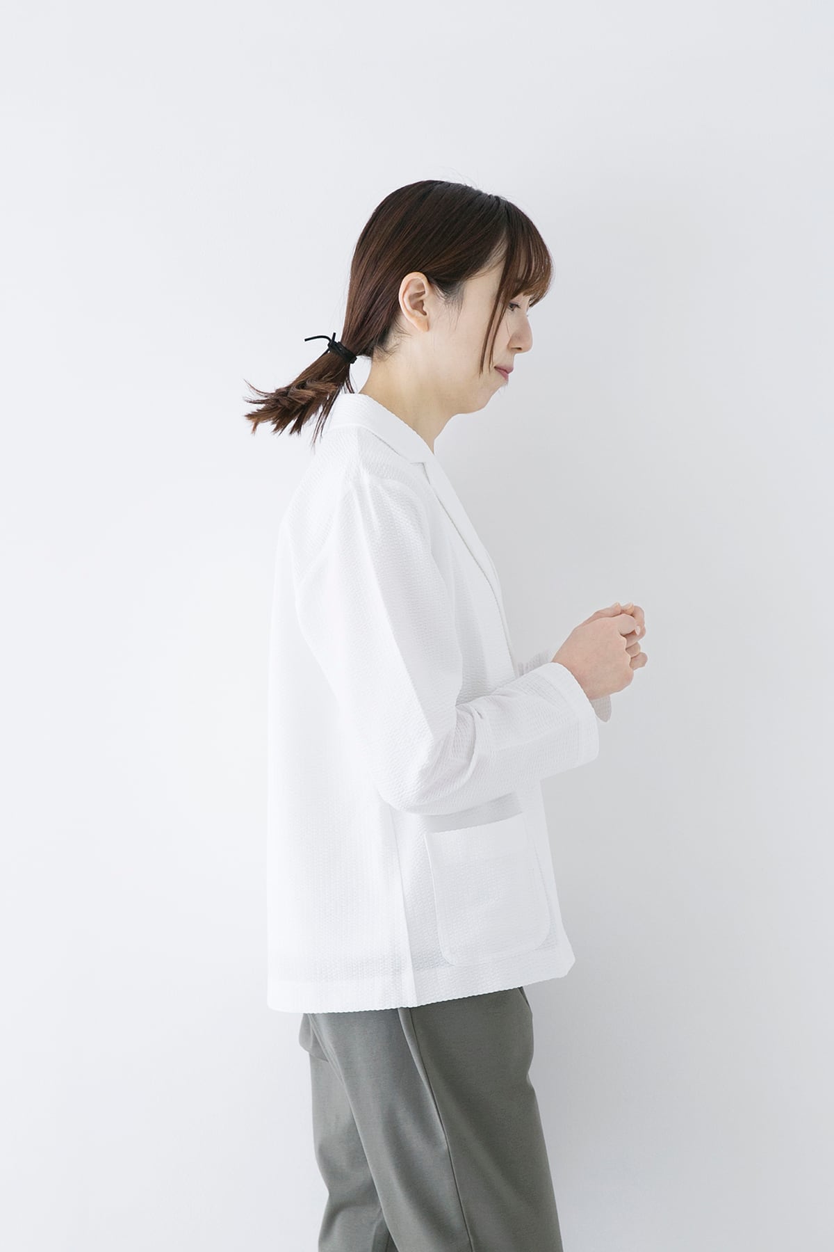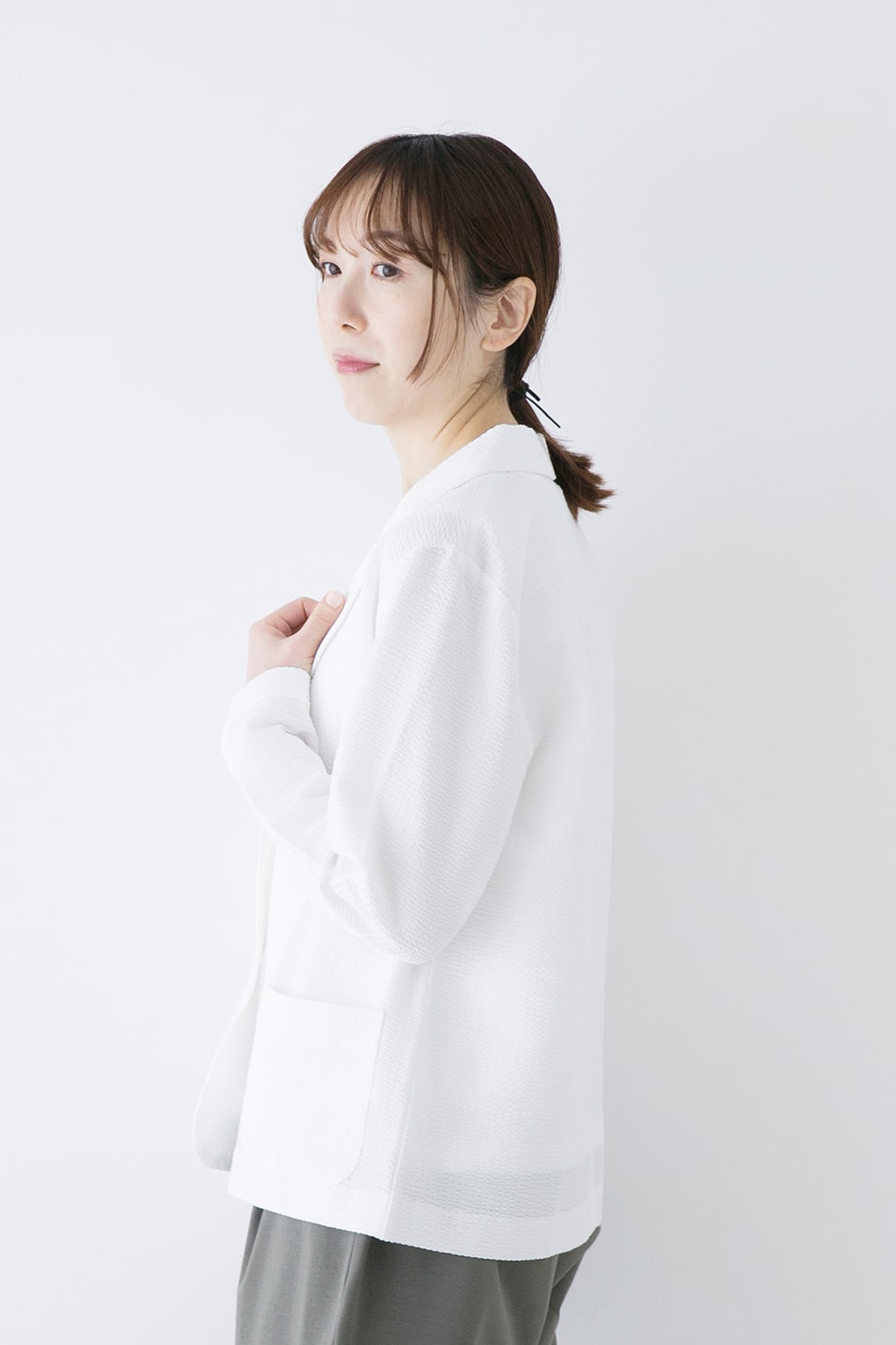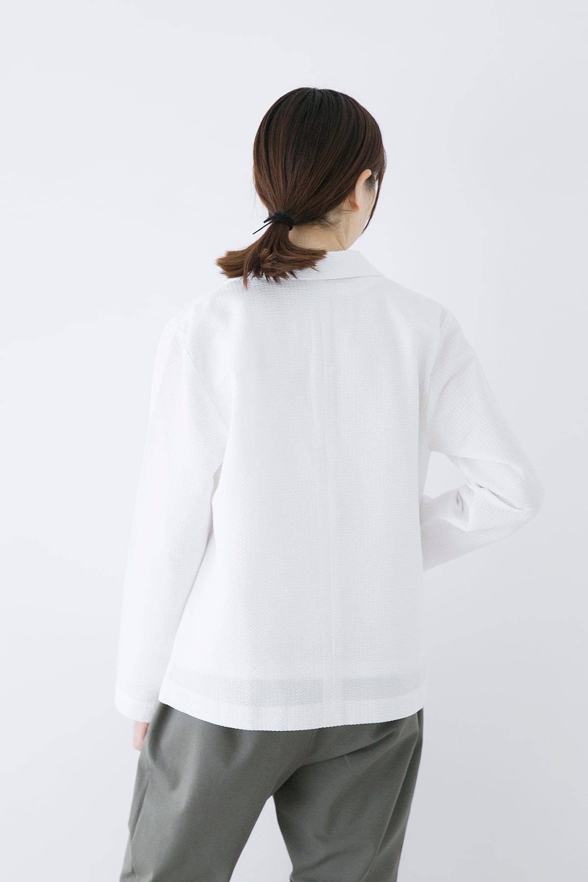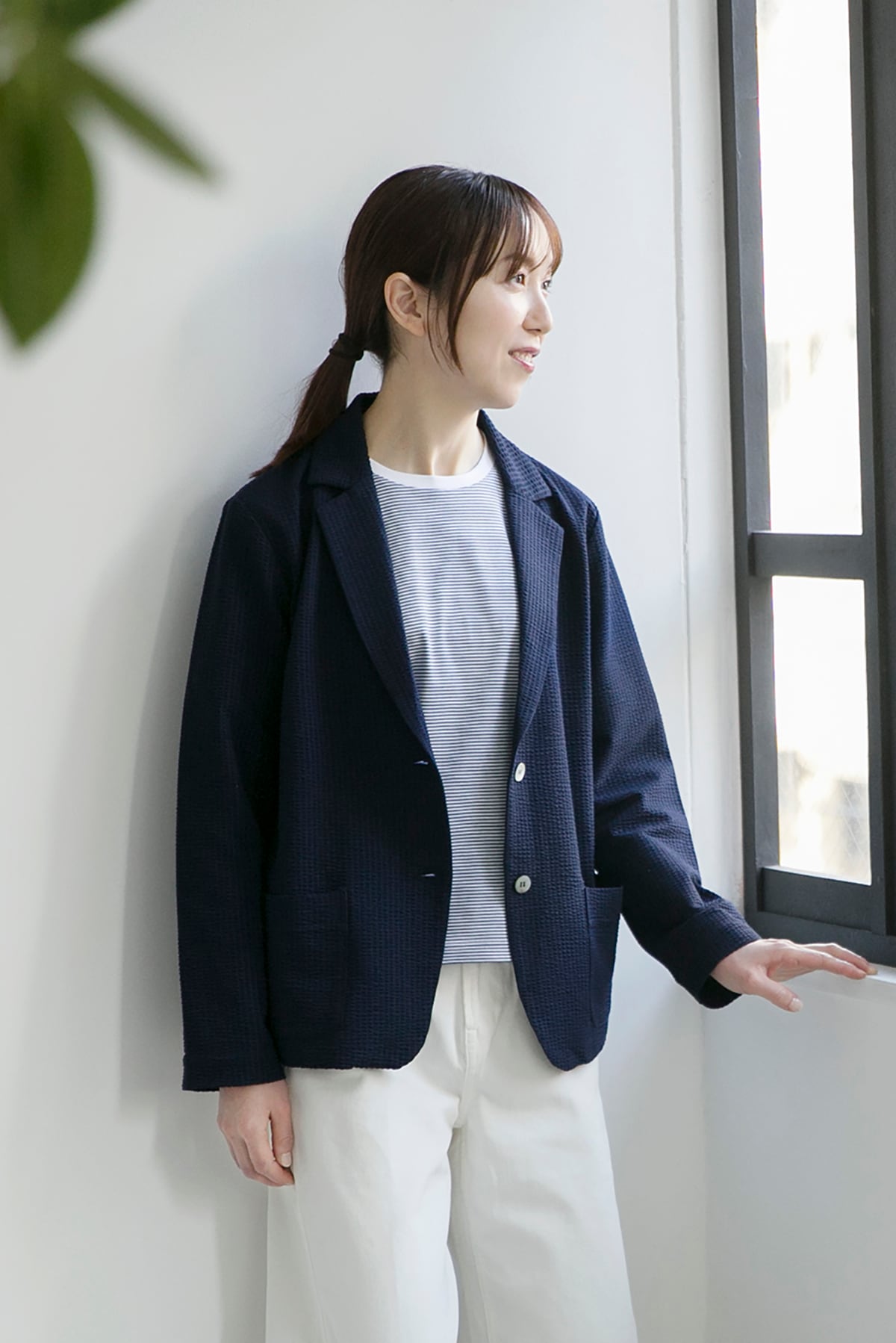 軽くて伸縮性のあるサマージャケット。サッカー生地のような編地は綿糸とポリエステル糸を使い分けることで凹凸のある表面となっています。布帛のようなコンパクトな表面ですが、伸縮性があり窮屈さがありません。ラフに羽織れる夏のお出かけ着として着用して頂きたいジャケットです。