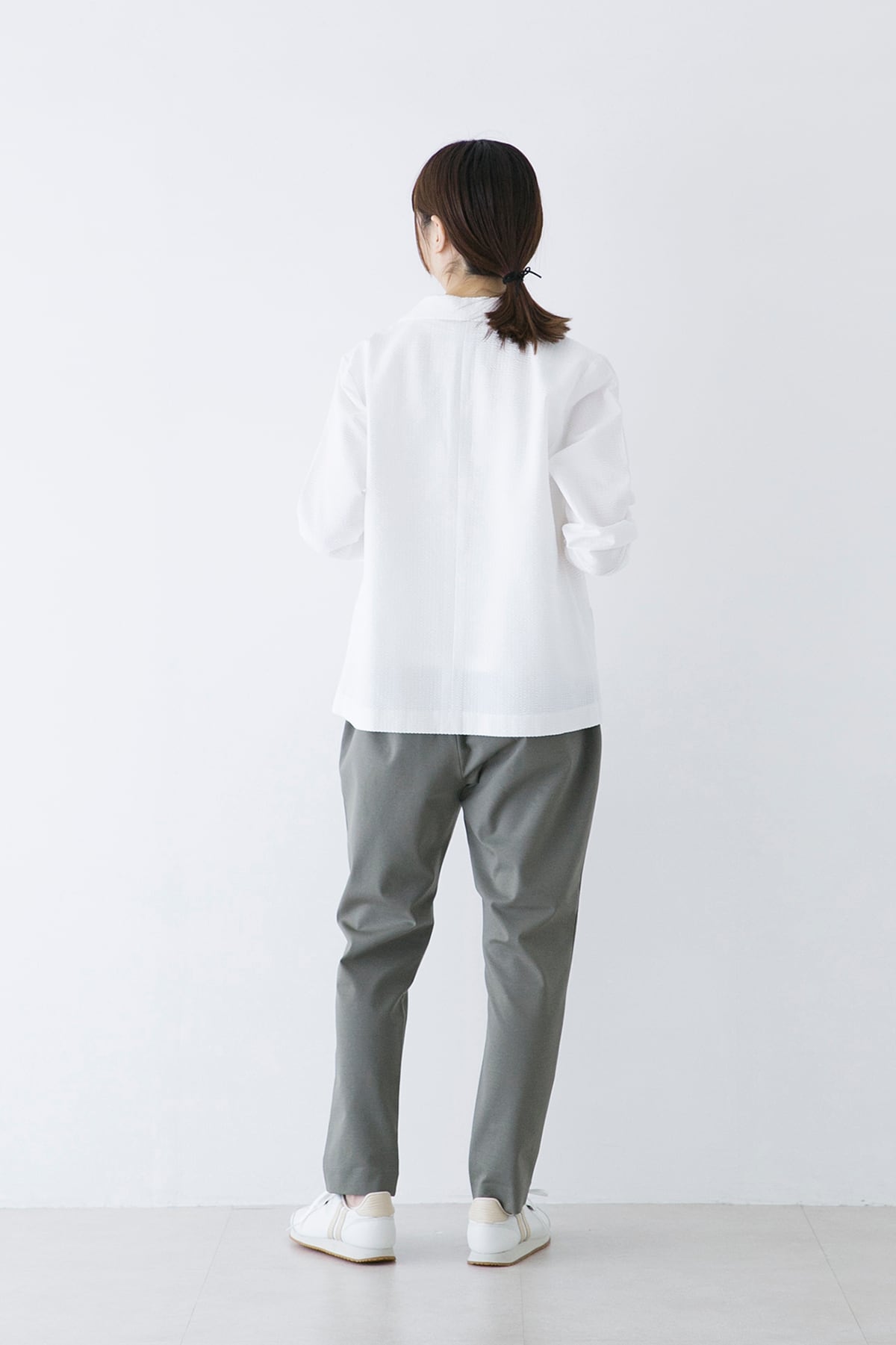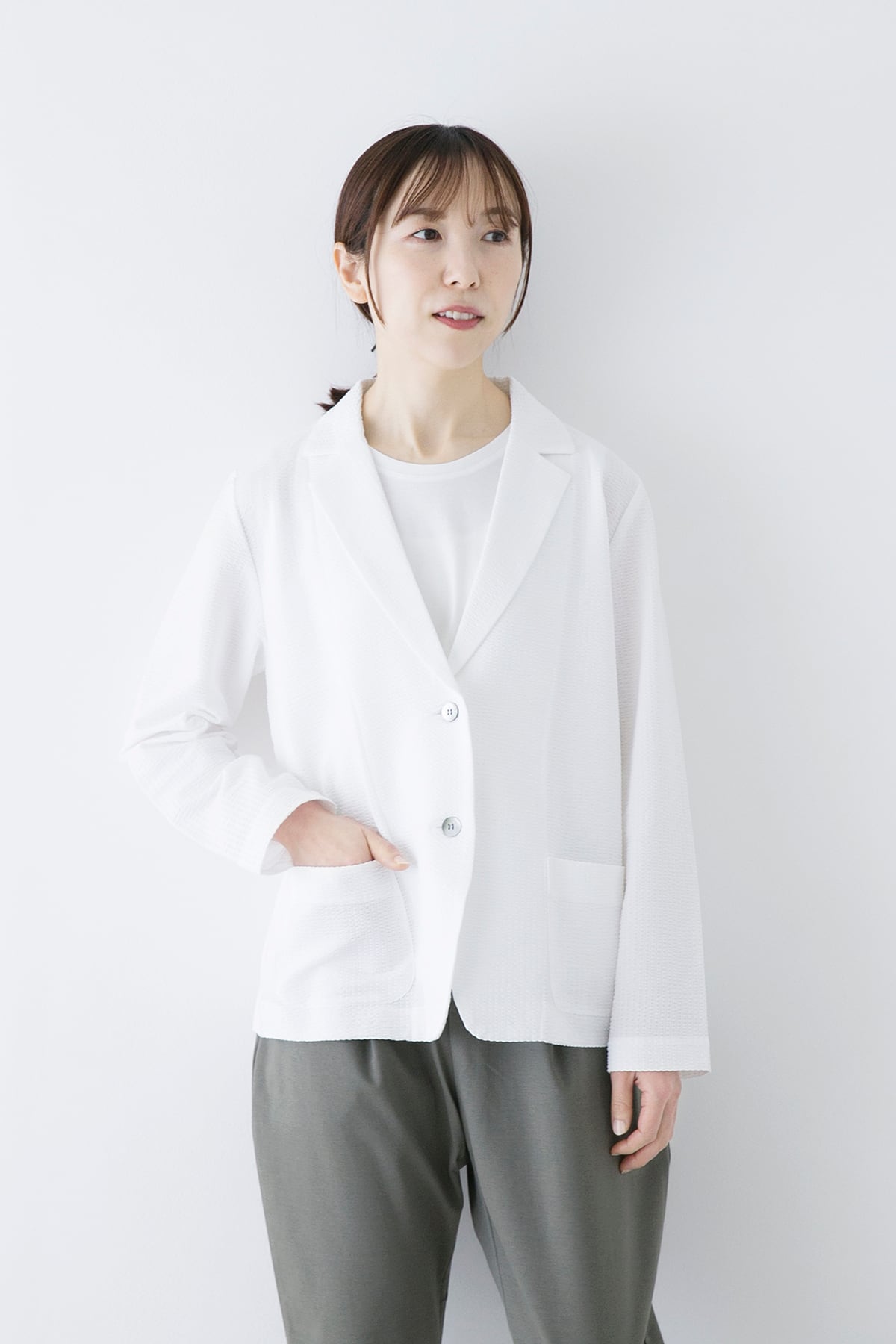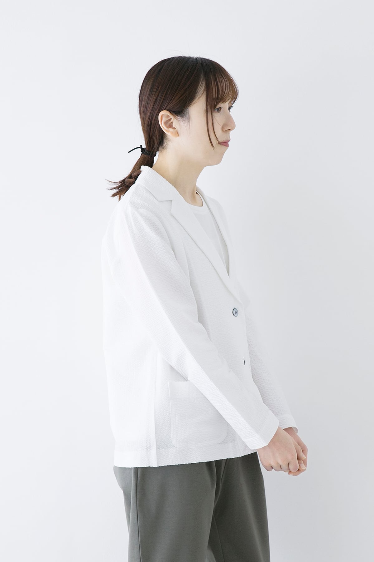 軽くて伸縮性のあるサマージャケット。サッカー生地のような編地は綿糸とポリエステル糸を使い分けることで凹凸のある表面となっています。布帛のようなコンパクトな表面ですが、伸縮性があり窮屈さがありません。ラフに羽織れる夏のお出かけ着として着用して頂きたいジャケットです。