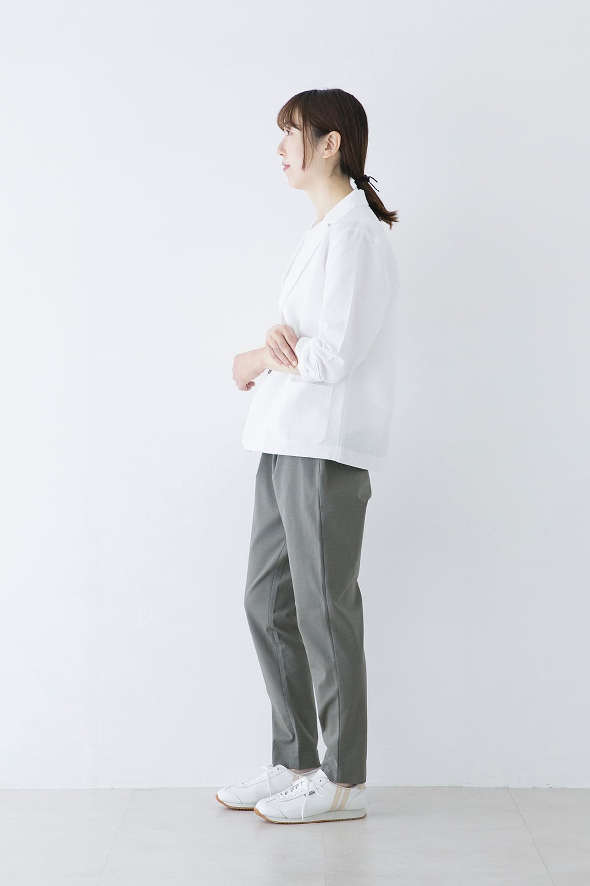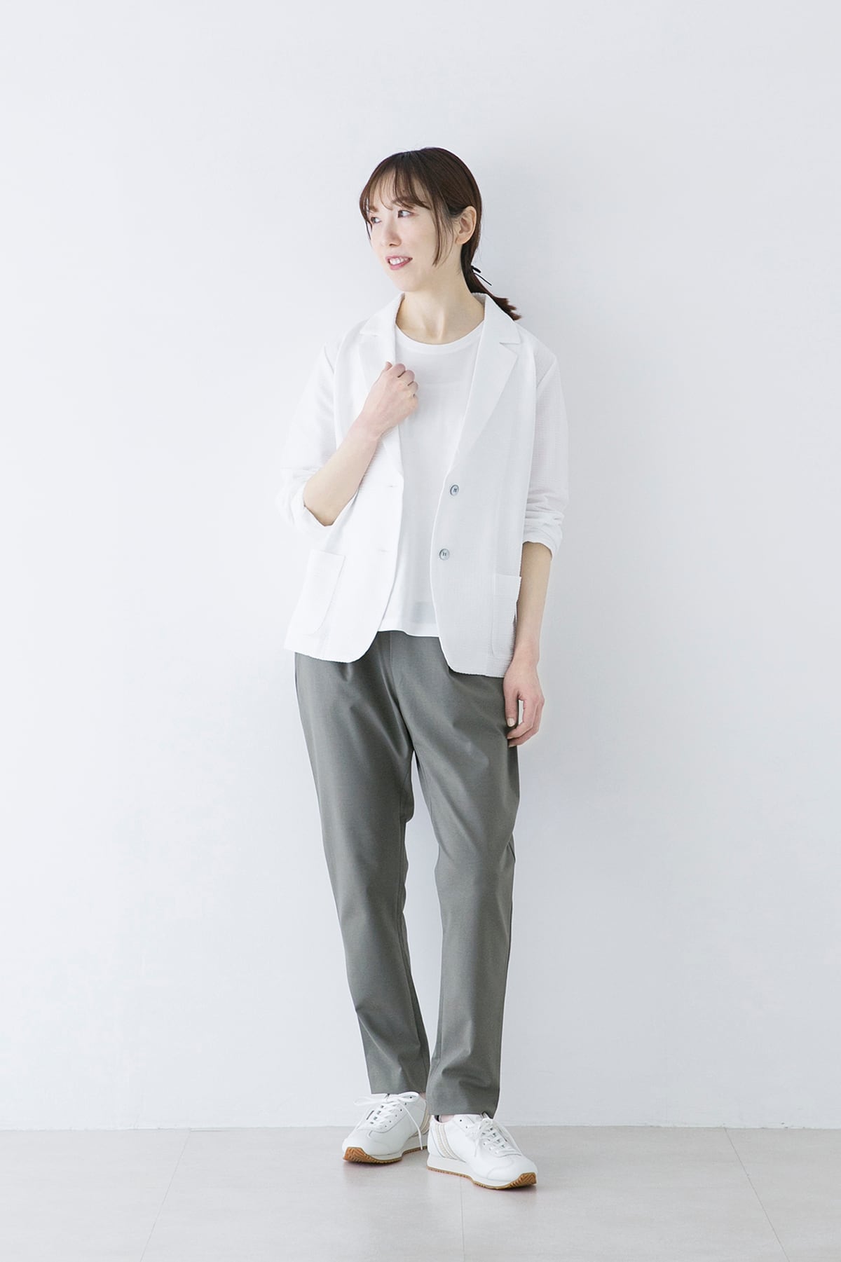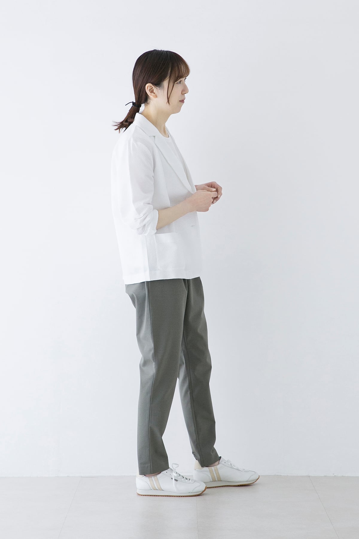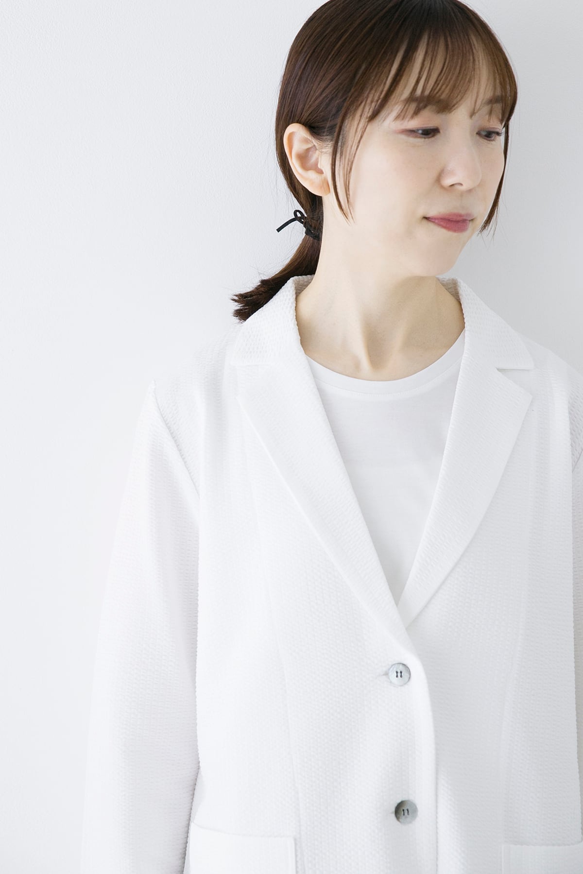 軽くて伸縮性のあるサマージャケット。サッカー生地のような編地は綿糸とポリエステル糸を使い分けることで凹凸のある表面となっています。布帛のようなコンパクトな表面ですが、伸縮性があり窮屈さがありません。ラフに羽織れる夏のお出かけ着として着用して頂きたいジャケットです。