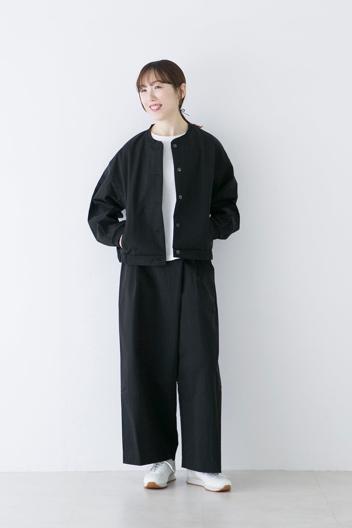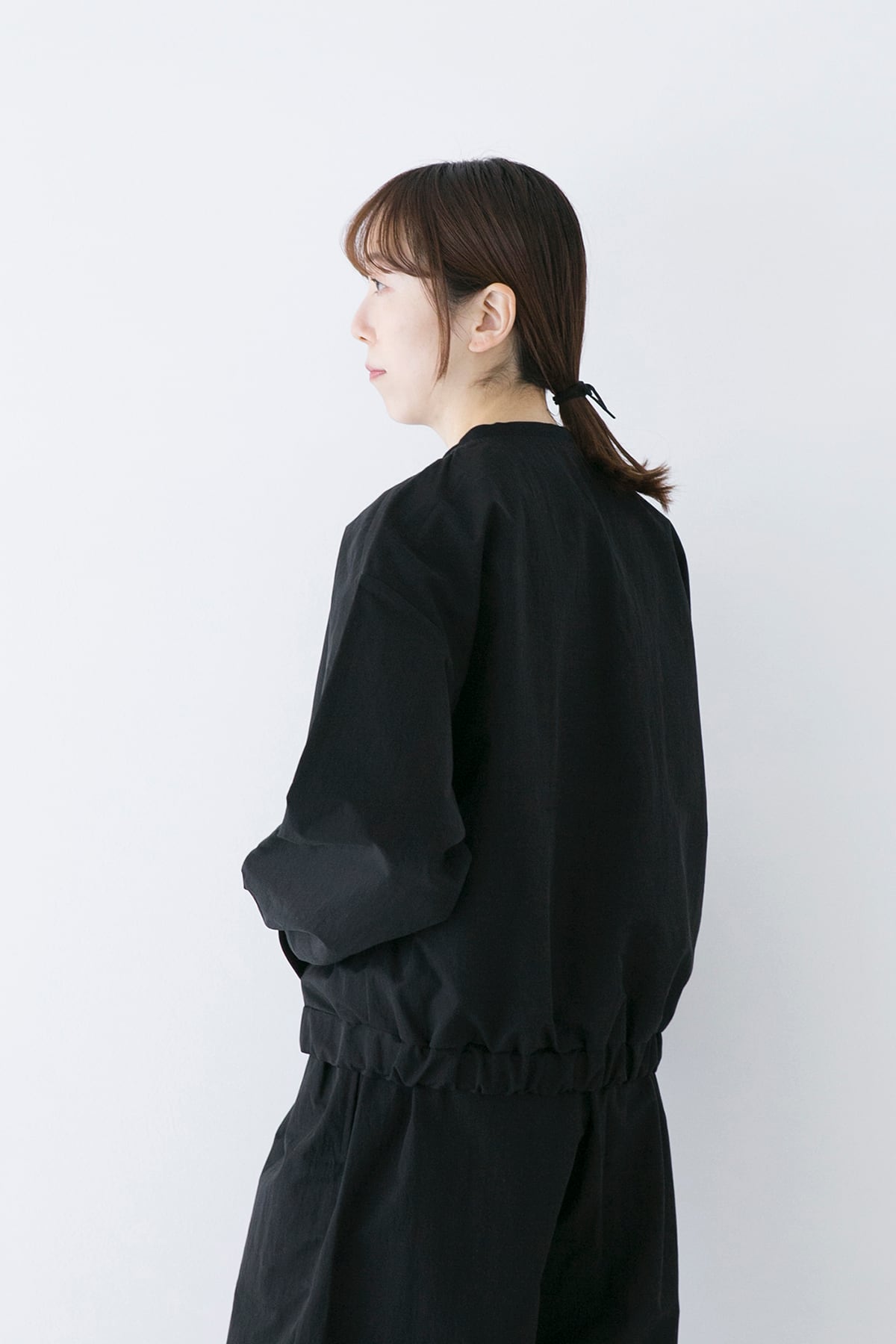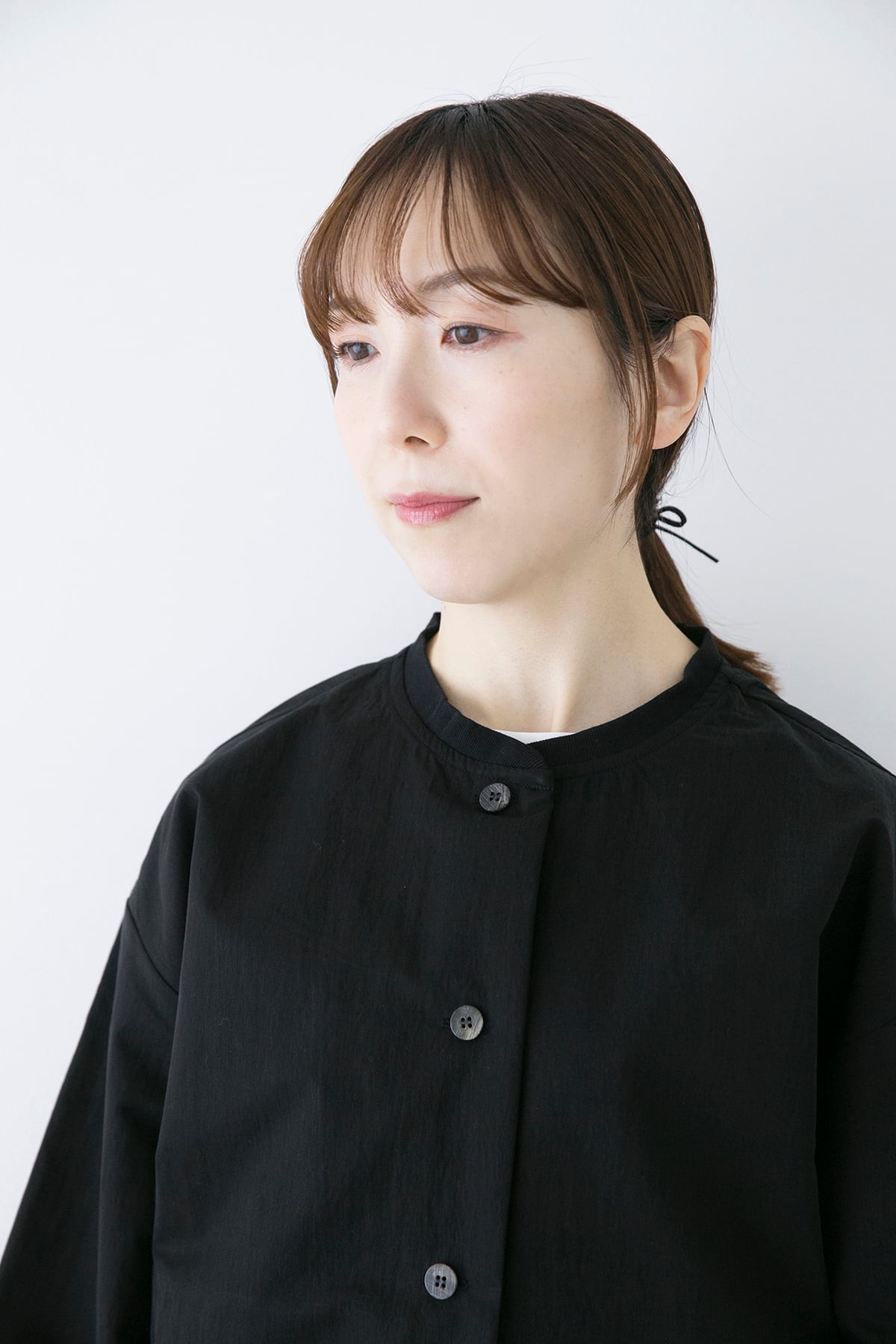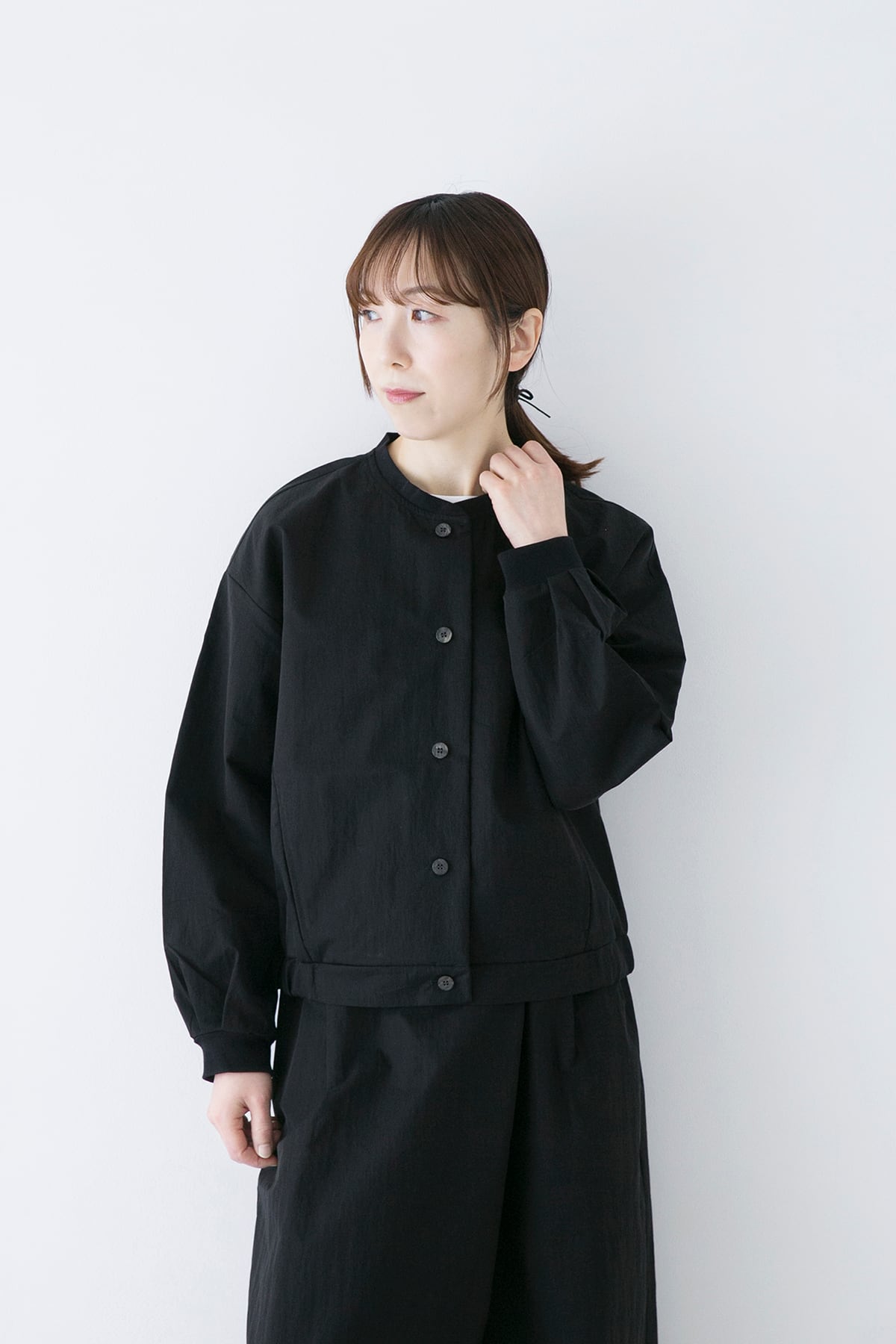 便利な春先の羽織りもの。タテ糸に綿糸、ヨコ糸にポリエステル糸を用いることで従来のギャバよりソフトで軽い素材になっています。しっかりとした打ち込みの素材なので春先や初秋など季節の狭間やご旅行などにはお勧めの羽織りものです。あまりアクティブにならないよう衿元と袖口は小さなリブ仕上げにしています。