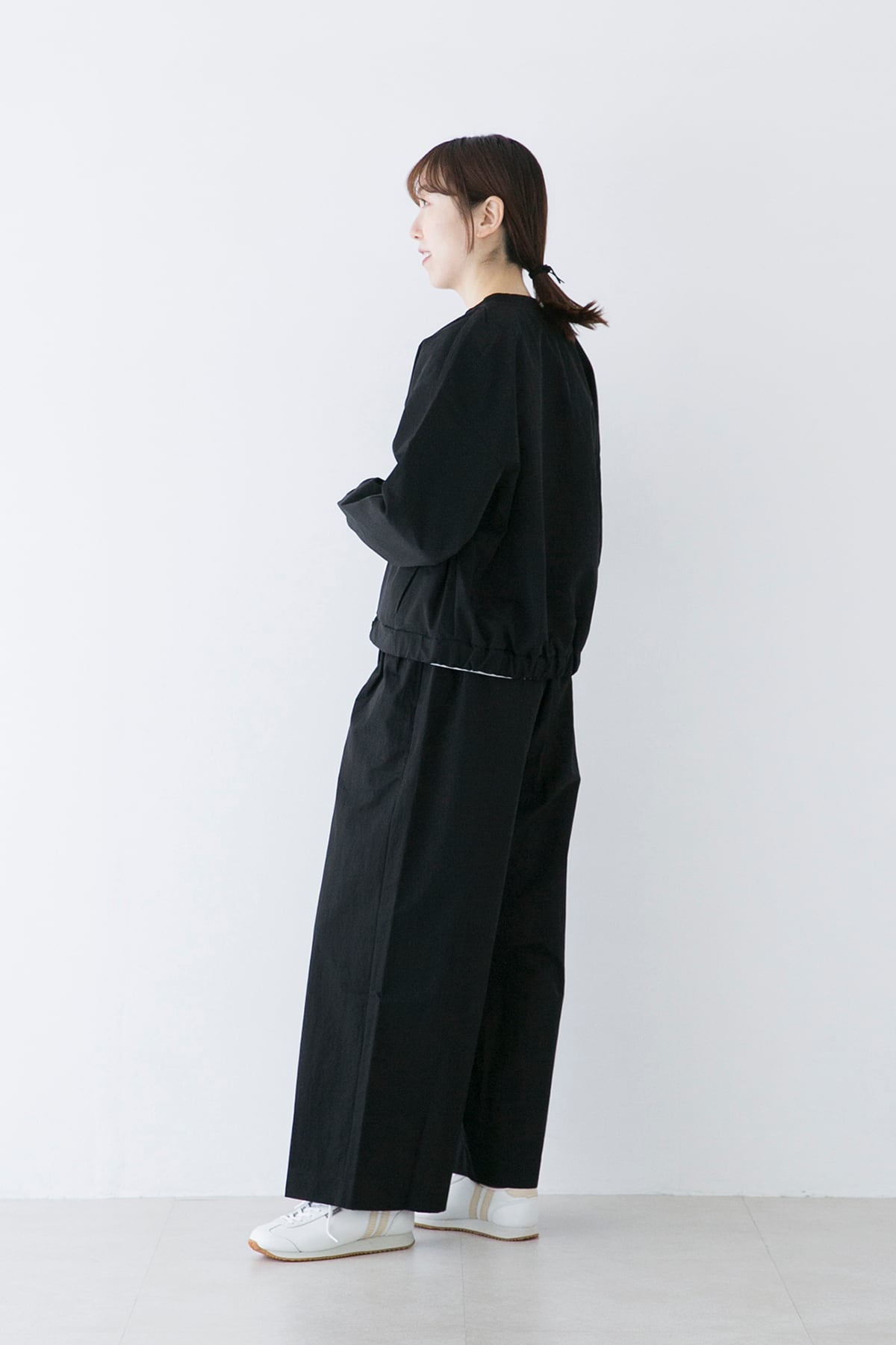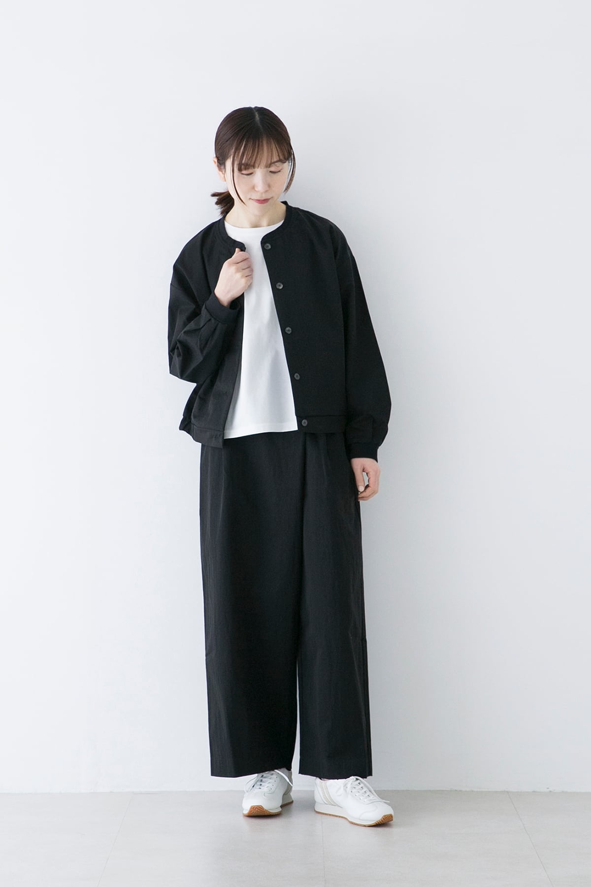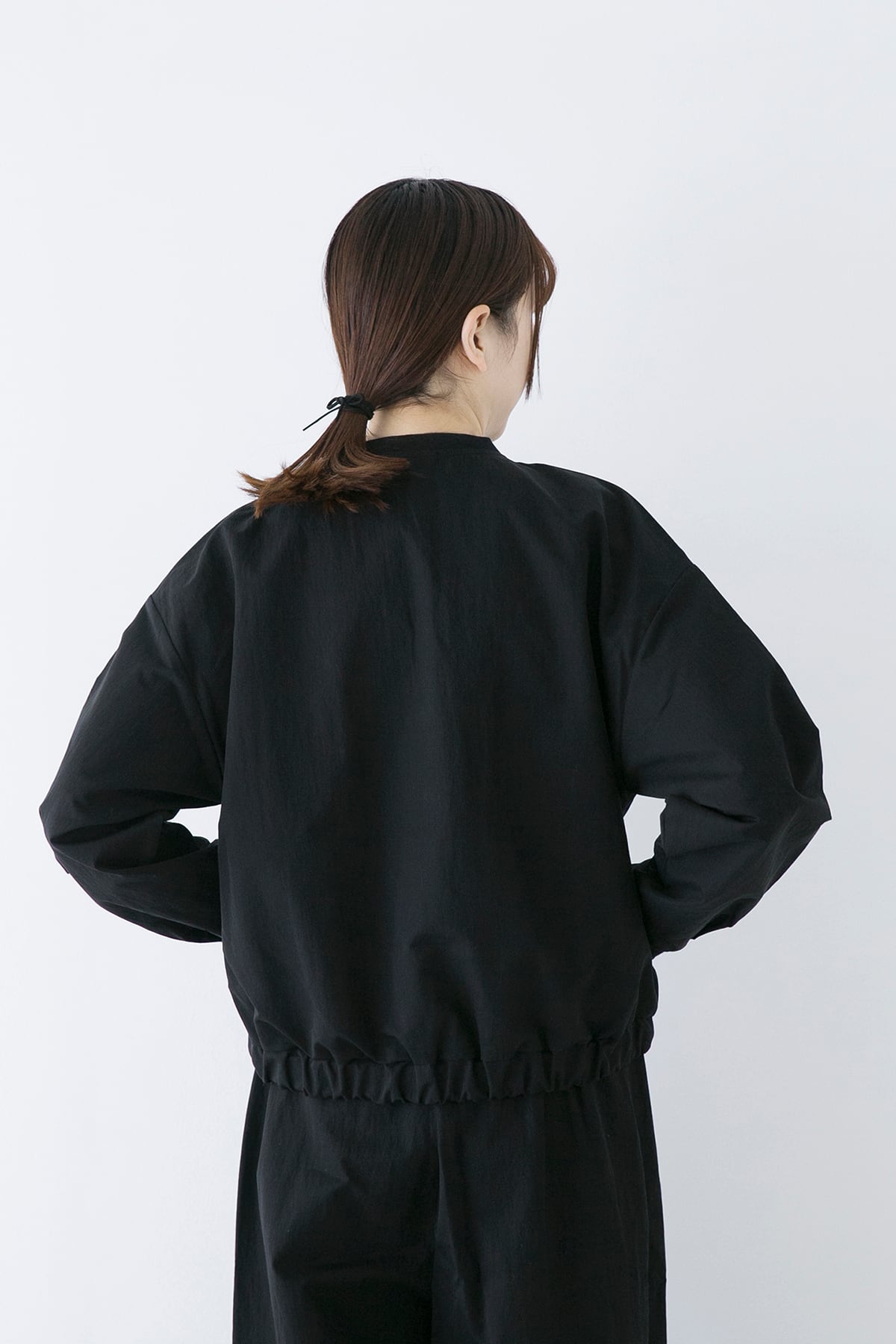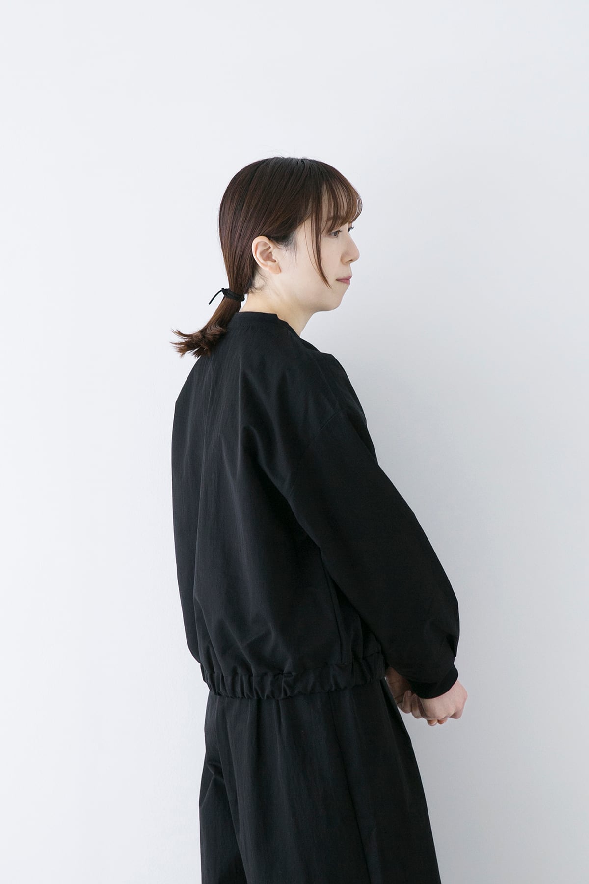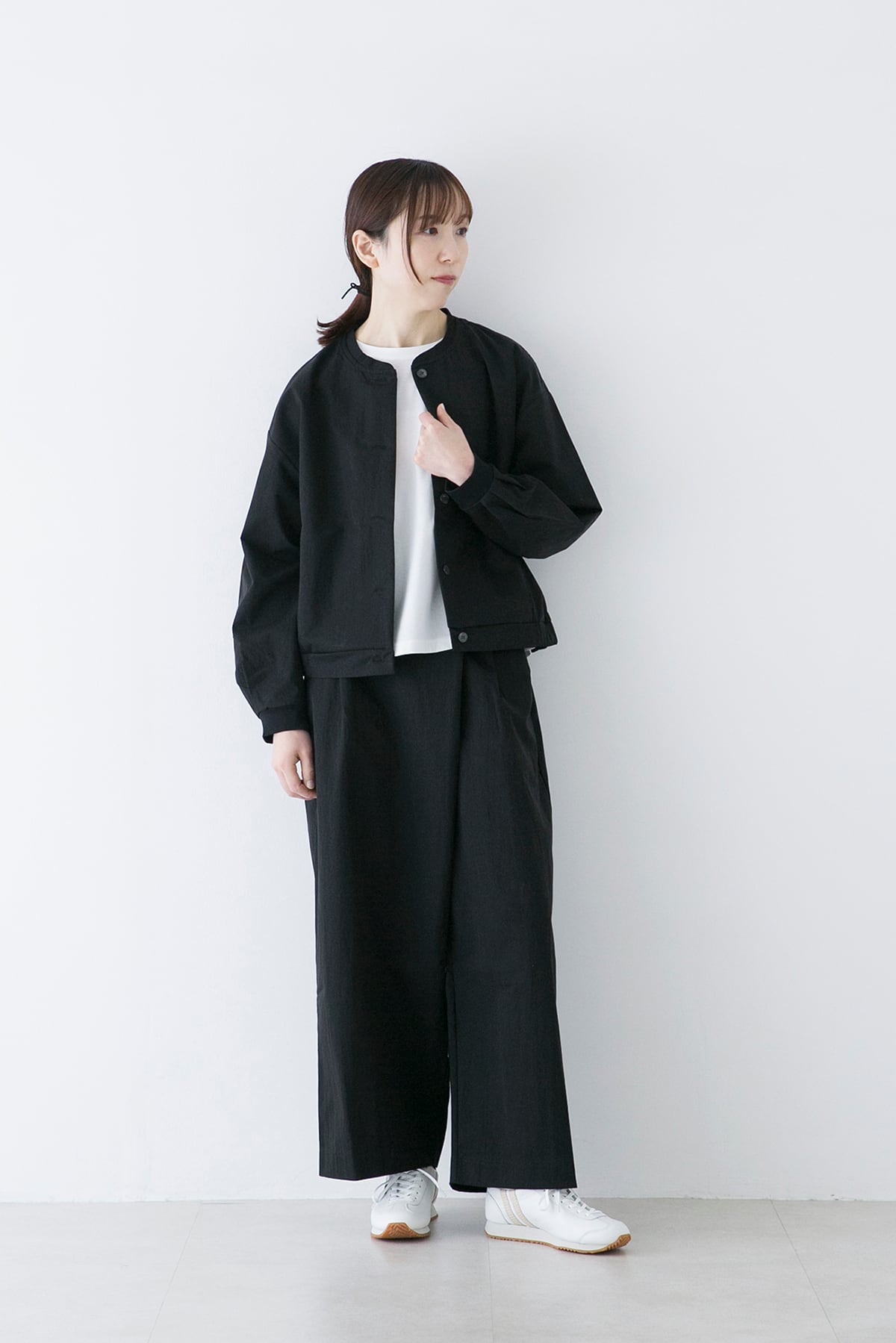 便利な春先の羽織りもの。タテ糸に綿糸、ヨコ糸にポリエステル糸を用いることで従来のギャバよりソフトで軽い素材になっています。しっかりとした打ち込みの素材なので春先や初秋など季節の狭間やご旅行などにはお勧めの羽織りものです。あまりアクティブにならないよう衿元と袖口は小さなリブ仕上げにしています。